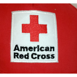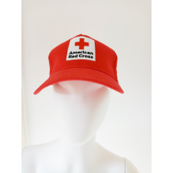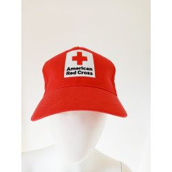 Cappello baseball in cotone 100% twill spazzolato, rinforzo frontale con visiera preformata, colore rosso con patch rettangolare dimensione cm 5x5,5 bianca con croce rossa e scritta AMERICAN RED CROSS. Misura regolabile con nastrino a blocco metallo.