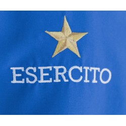 Sul retro del giubbino, nella parte alta delle spalle, è presente un ampio ricamo (circa 37 x 20 cm) con la scritta “ESERCITO” in filo bianco e stella in filo oro, molto visibile e dal forte impatto, tipico dell’abbigliamento militare Esercito Italiano. Questo dettaglio rende il giubbino perfetto come tuta ginnica esercito, abbigliamento militare uomo e capo per chi vuole valorizzare l’appartenenza o la simpatia verso le Forze Armate.