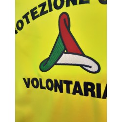 • Grande visibilità posteriore: Sul retro, un grande ricamo in filo nero con la scritta "PROTEZIONE CIVILE VOLONTARIATO" e l'elica tricolore al centro, con dimensioni imponenti di 26x16 cm.
